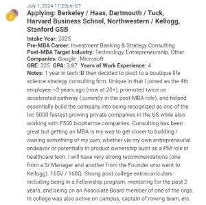 This week’s first MBA admissions candidate began in investment banking, but soon switched to strategy consulting focused on life sciences. They have a very strong GPA of 3.87; their GRE is OK, but does not stand out.