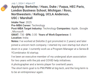 This week’s second MBA candidate appears to have a strong tech-focused career in India, having graduated from a top Indian university. They have a decent GMAT of 730, their GPA is 6.8 out of 10. Their post MBA goal is product management, then entrepreneurship.