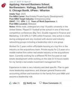 The final MBA candidate for this week played Division 1 football in the Big Ten Conference, and has now pursued a career in Real Estate. Post MBA they plan to join their family firm in Real Estate. They have a very strong GMAT (705); their overall GPA is a little weaker.
