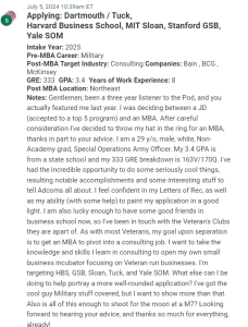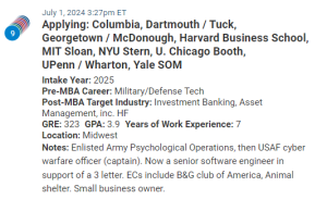 This week’s second MBA candidate is also from the military, and is applying for their MBA after also considering going to law school. They also have a super GRE of 333, and very interesting experiences in the military in special operations.