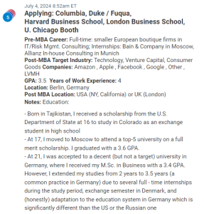The final MBA candidate for this week is originally from Tajikistan, and she’s worked and been educated in several countries including Russia and Germany. We think adcom will really like her profile, but may have concerns with potentially weaker quant skills, and fuzzy post-MBA goals.