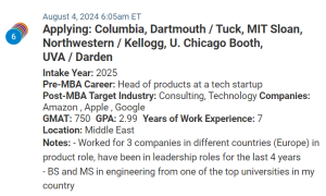 This week’s first MBA admissions candidate has a super GMAT score of 750 but has a more modest undergraduate GPA of 2.99. They also have a graduate degree, and both degrees are in engineering. Their work experience appears to be very decent, in tech product management. Their post MBA goals are to pursue consulting in the short term, and then return to the tech industry.