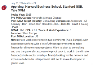 This week’s second MBA candidate also has a super GMAT score (760), but also has a poor undergraduate record. They were compromised by their mental health. They completed an MBA directly after their undergraduate degree, to help compensate. They work in climate finance, and ultimately want to return to this field after a stint in consulting.