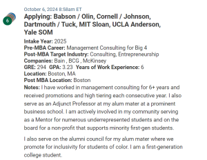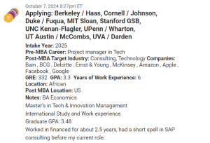 This week’s first MBA admissions candidate is from Africa and has a GRE of 332. They also have a graduate degree. They appear to have very solid work experience and are active outside of work. They are targeting Sloan in Round 1, and then additional programs in Round 2.