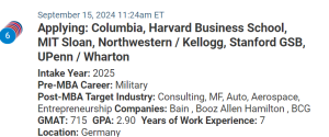 This week’s second MBA candidate is from the US military and has a very strong GMAT of 715. We do worry about their 2.9 GPA, for which they did provide some mitigating circumstances. They also have a high GPA in their graduate degree which may help.
