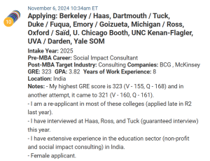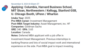 This week’s second MBA candidate is a deferred-admissions candidate. They have a perfect GRE score of 340 and appear to have all the pre-conditions for a strong profile. They are targeting all the top 7 MBA programs; we think they can shorten that list.