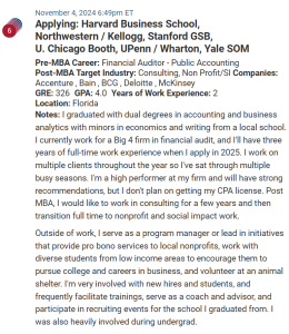 The final MBA candidate has a perfect GPA of 4.0. They work in audit in Florida, and are planning to apply next season, with three years of experience. They also have decent activities outside of work. We discussed their application strategy and things they can do now, to improve their overall profile.