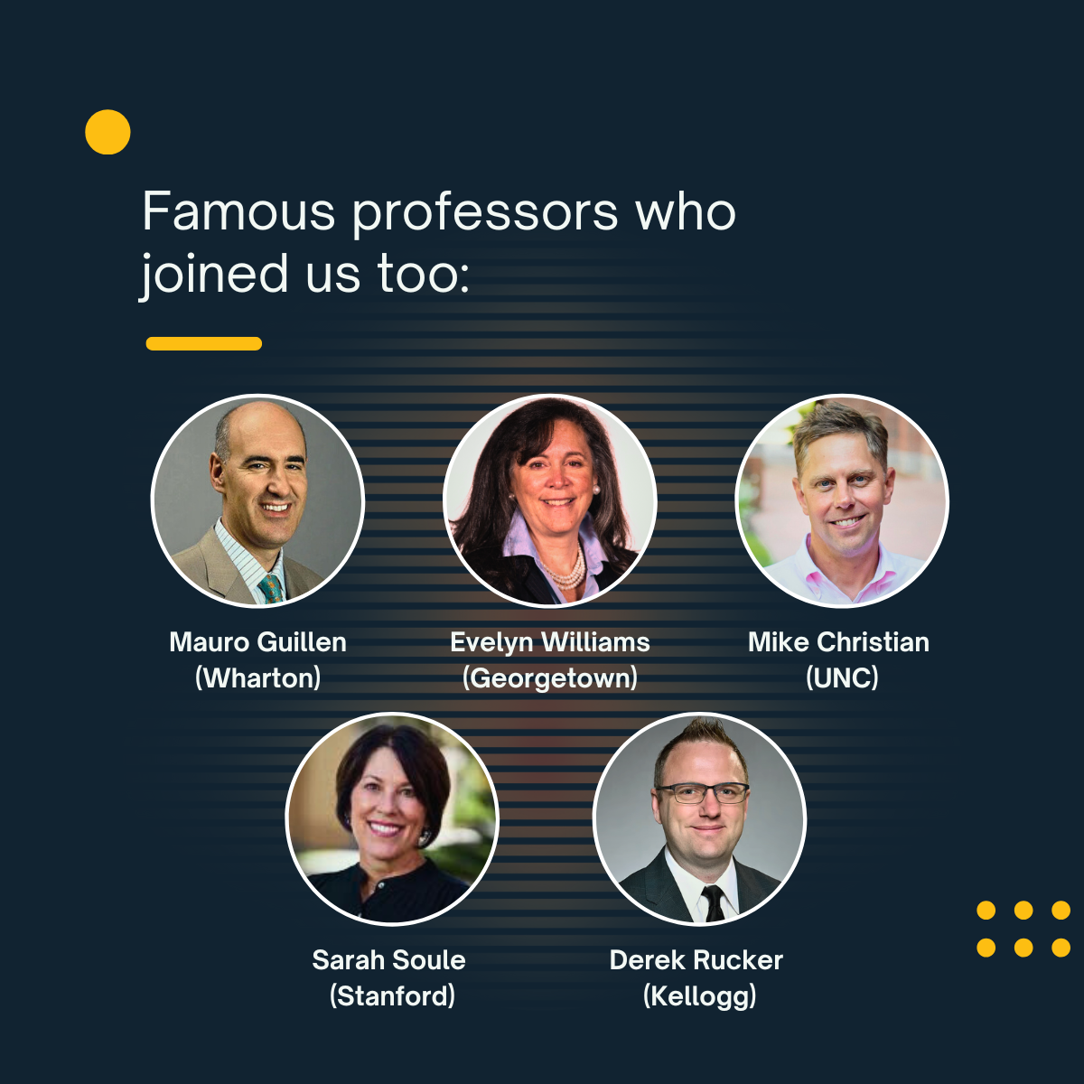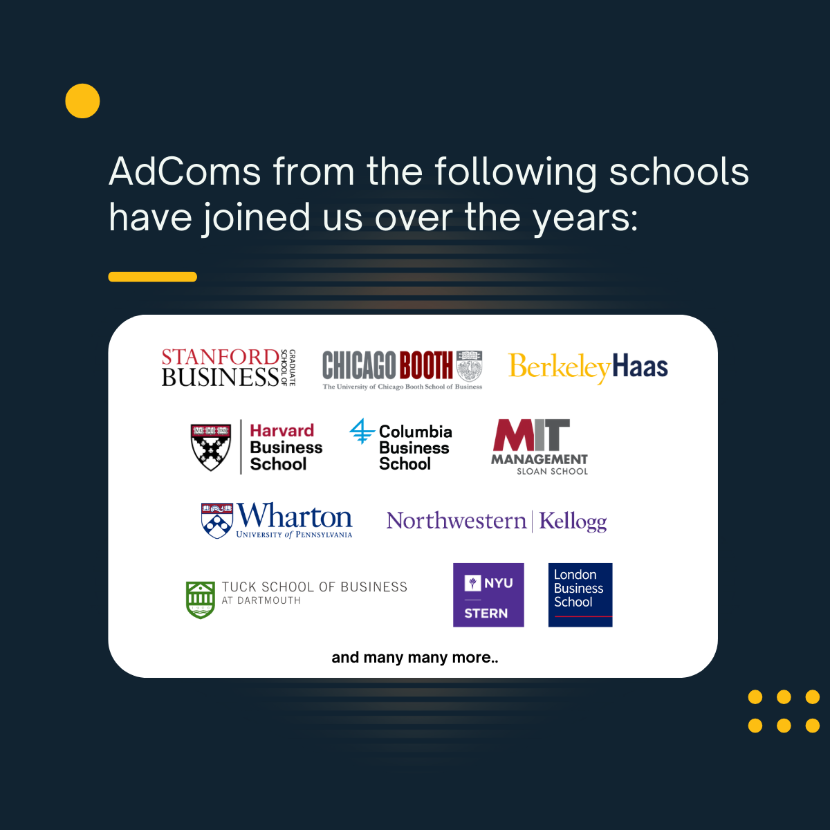 Berkeley Haas, Chicago Booth, Columbia Business School, Dartmouth Tuck, Harvard Business School, London Business School, MIT Sloan, Northwestern Kellogg, NYU Stern, Stanford GSB, The Wharton School and many more.