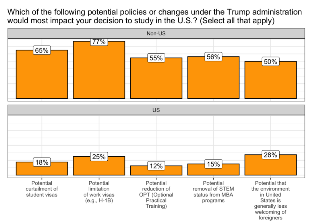 There was a marked concern over whether foreigners would be able to stay in the US under the new administration—even if they wanted to. The doubts around work visas, student visas, STEM designations, and OPTs rang alarm bells for well over half—sometimes up to 77%—of our non-US citizen respondents.