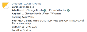 The final MBA candidate is deciding between UPenn / Wharton and Chicago / Booth. Booth is offering them additional scholarship, but we wonder if that is enough to influence their final decision.