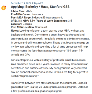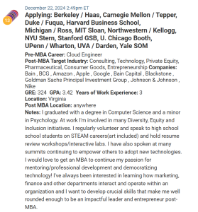 This week’s second MBA candidate is only targeting two programs, Berkeley / Haas and Stanford, which we think is very risky. Their GRE score is 318, which will present significant challenges for these two programs.