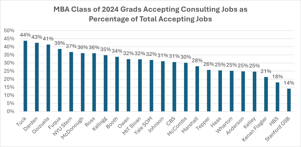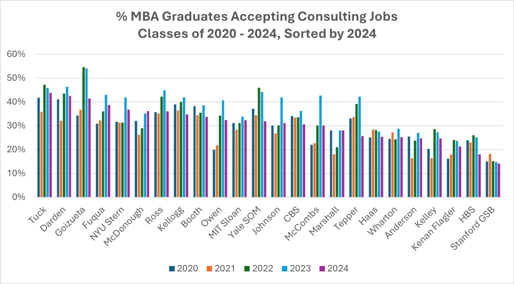 A similar story is shown when reviewing the five-year trends in the percentage of MBA graduates accepting jobs in consulting from the Class of 2020 to the Class of 2024.
