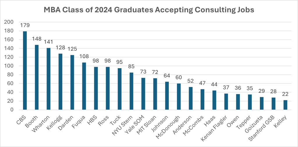 While these MBA programs continue to send a large number of graduates into consulting industry jobs, there was a marked decline in consulting jobs accepted by MBA graduates the Class of 2024 when compared to the number of consulting jobs accepted by MBA graduates in the Class of 2023.
