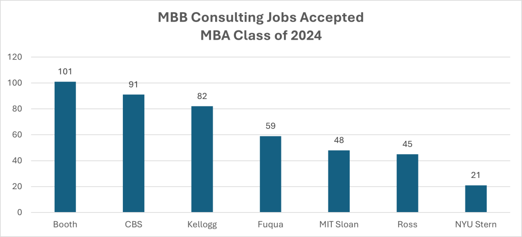 Chicago / Booth (101), CBS (91) and Northwestern / Kellogg (82) placed the most Class of 2024 graduates into MBB jobs, followed by Duke / Fuqua (59), MIT / Sloan (48), Michigan /Ross (45) and NYU / Stern (21).