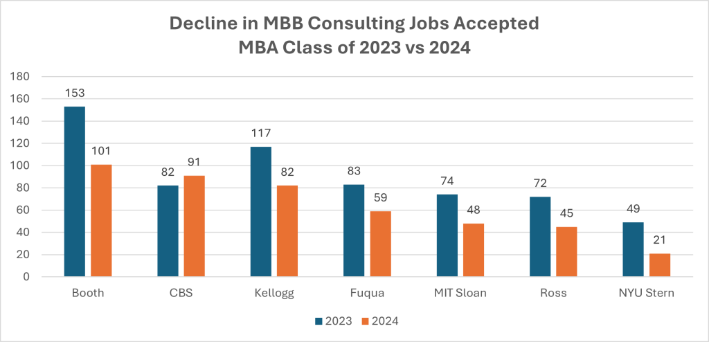 While these Class of 2024 MBB job placement statistics are quite strong, they do represent a decline from the MBB jobs accepted for the Class of 2023: