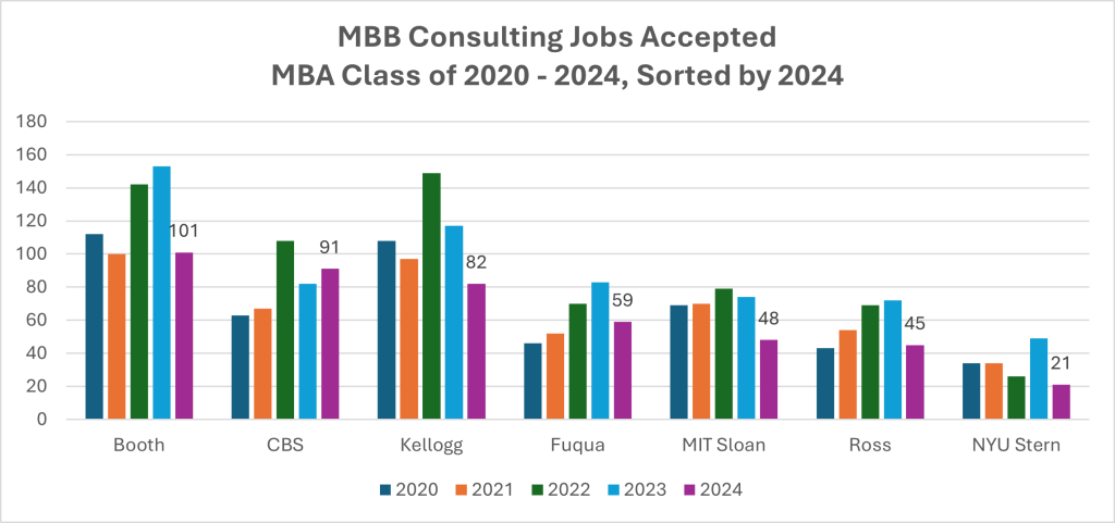 We begin by reviewing the total number of MBB consulting jobs accepted for the Class of 2024 for these seven MBA programs.