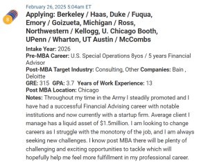 This week’s first MBA admissions candidate is applying next season, and had experience in the military in special operations, as well as more recent role as a financial advisor. They have a total of 13 years of experience, but we worry their current GRE score of 315 is a little low.