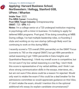 This week’s second MBA candidate is still in college and is applying via the deferred admissions process. They have outstanding credentials, despite their 48th percentile in the verbal reasoning section of the GMAT.