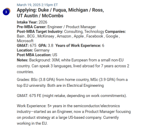 This week’s second MBA candidate is an electrical engineer who also has a master’s degree. They work in the semiconductor industry as a product manager; they also have a 675 GMAT score.