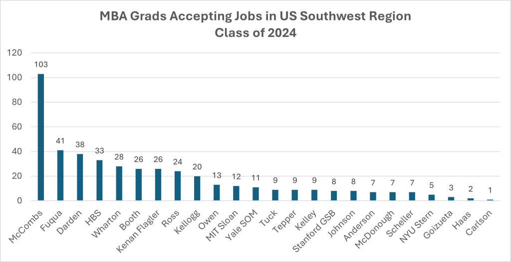 Now we will review the total number of Class of 2024 MBA graduates from these business schools who accepted jobs in the Southwest.