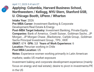 This week’s first MBA admissions candidate has a 675 GMAT score and a strong GPA. They are from Peru and working in Chile. They have six years of work experience, which does include a five-month gap.