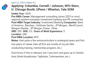 This week’s second MBA candidate is from Central Asia, now working in Dubai. They have a 330 GRE score, but we are unsure how strong their academic experience has been.
