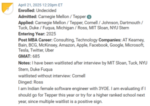 The final MBA candidate has an offer from CMU / Tepper and is on the waitlist at several other top MBA programs. They are debating whether they should take the Tepper option, if not admitted from the waitlists, or reapply next season.