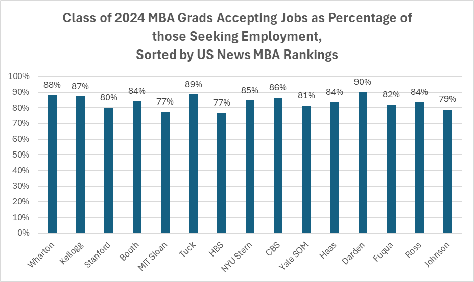Clear Admit Co-Founder Eliot Ingram says, “While U.S. News incorporates employment rates into its rankings, the employment stats published by business schools do not appear to be correlated with the rankings. For example, below is a chart showing the decline in MBA graduates accepting jobs as a percentage of those seeking employment for the Class of 2024 vs. the Class of 2023.”