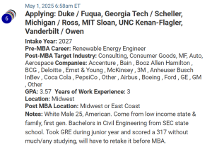 This week’s first MBA admissions candidate is an engineer who is now working in the renewable energy space. They have a 3.57 GPA and need to retake the GRE.