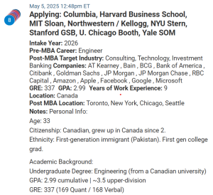 This week’s second MBA candidate is from Canada, and is also an engineer, working in Toronto. They have nine years of experience, and a 337 GRE.