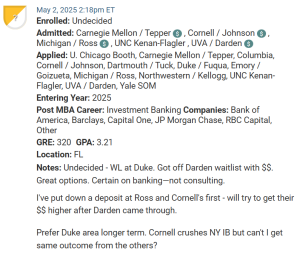 The final MBA candidate is deciding between Cornell / Johnson, UVA / Darden and Michigan / Ross, and is seeking a career in investment banking.