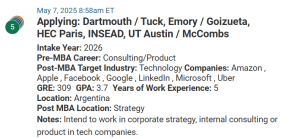 This week’s second MBA candidate is from Argentina and appears to have a very interesting profile, but their GRE score of 309 is going to be an issue. They plan to retake. We also think they should reconsider their school targeting.