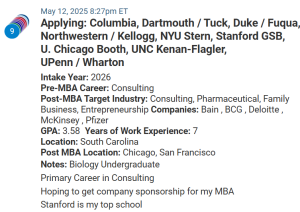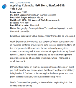 This week’s first MBA admissions candidate has a 695 GMAT and 3.8 GPA. They are seeking a top MBA with goals to pivot to the entertainment industry.