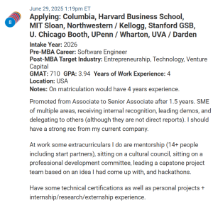 The final MBA candidate is a software engineer with a 3.94 GPA. They have a 710 GMAT score, and we are hoping they might retake the GMAT.