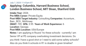 This week’s first MBA admissions candidate is from Georgia and works in Private Equity. They also have a 705 GMAT score.