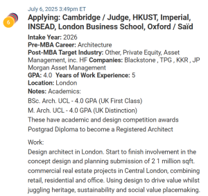 This week’s second MBA candidate is an architect in London and wants to transition into real estate private equity. They still need to take the GMAT or GRE.