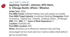 The final MBA candidate was enlisted in the military and now works in banking. Their short-term goal, post MBA, is investment banking. They have a 332 GRE score.