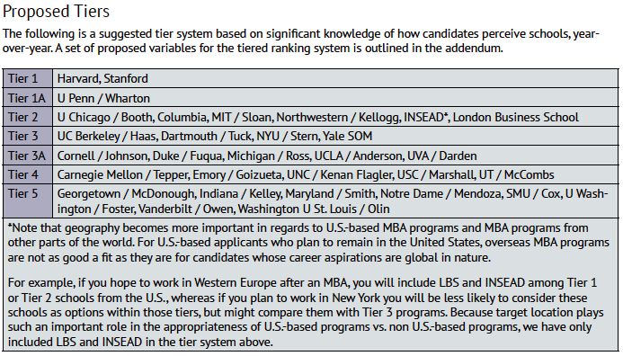 The challenge to the tiered system is to take into account the size of the school. Size impacts intimacy and engagement and the breadth of resources available (i.e. classes, clubs, industries recruiting, critical mass of interest in niche events), impacting the diversity of choice, options, and classmates. How do you design a system that gives an equal voice to the smaller programs like Dartmouth/Tuck?