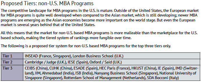 In grouping schools, I also found it very hard to place non U.S.‒based schools within the same tier as U.S.‒based schools. While I am convinced that INSEAD and London Business School are comparable to “M7” schools in the United States when considered in terms of their general competitiveness, the issues of geography and career focus do come into play. For a candidate whose aspirations are to work in Europe, for example, INSEAD and London Business School would most certainly be comparable to Tier 1 and 2 schools. But for a candidate hoping to work in New York City, the leading European schools would compare with Tier 3 or 4 schools in terms of the U.S. career access they can provide. This is why I developed a separate tiered ranking system for non U.S.‒based schools. A separate ranking also made sense given that the competitive nature of the marketplace is still developing, especially in Asia.