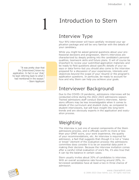 Understand the NYU MBA admissions interview! Frequently asked questions, strategic analysis, and virtual interview information. Includes Clear Admit’s General Interview Guide and Analysis of Common Questions.