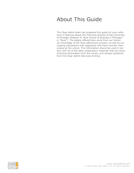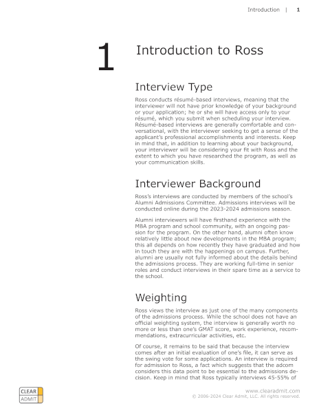 Get ready for your Ross MBA one-on-one admissions interview with this guide. Includes sample questions and strategic analysis, and advice for handling a virtual interview. Also includes Clear Admit’s General Interview Guide and Analysis of Common Questions.