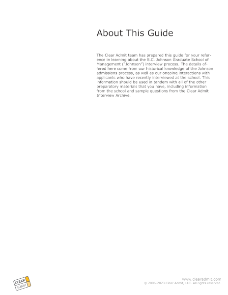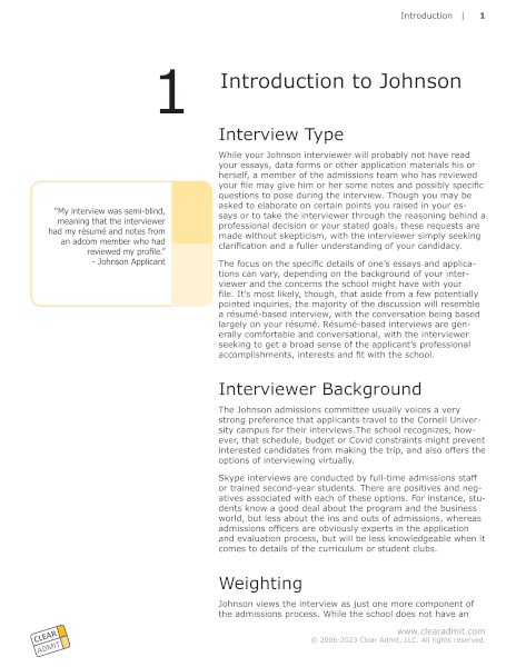 Learn about the Johnson School’s interview process and prepare with this detailed guide. Strategic tips and sample questions, firsthand accounts and virtual engagement opportunities. Includes Clear Admit’s General Interview Guide and Analysis of Common Questions.