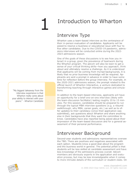 Gear up for Wharton’s team-based interview. The guide features Wharton-specific strategy, how to handle the Virtual Team Based Discussion, and ways to engage the school. Includes Clear Admit’s General Interview Guide and Analysis of Common Questions.
